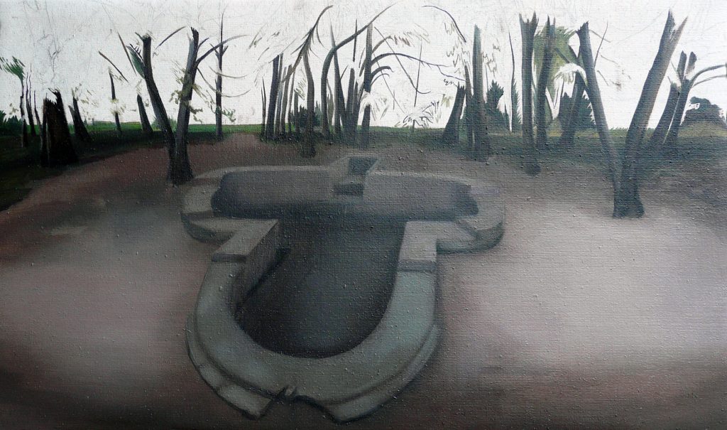 Llevo más de 25 años de trayectoria y en los primeros 15 la mayor parte de mi producción era pintura y grabado. La pintura siempre me ha parecido el medio con mayor dificultad, implica mayor intimidad, y sin querer lo cargo de trascendencia, y de cierto sentimiento de luto; siempre desde el artificio, el engaño, lo desacogedor, la reflexión sobre la propia disciplina, o la piel de la pintura. El grabado me permitía un mayor distanciamiento y disfrute, también la misma extrañeza, pero con algo de humor y la deriva del azar, incluso en la propia realización. Esta última década, sin abandonar la pintura, le he dado más dimensión al dibujo porque necesitaba volver a una imagen más ecléctica, como hacía en grabado, incorporando imágenes procedentes de otros ámbitos y épocas. En los últimos años echaba en falta lo objetual y pensé que la cerámica, también con su legado histórico, podía añadir valor y otros contenidos: la tradición griega, los ajuares funerarios, los fragmentos y restos… Necesito además aprender, enfrentarme a herramientas nuevas y tener la sensación de resolver problemas o dificultades. He realizado algunos tanteos con el video y la animación y espero que tengan más desarrollo, hacer pequeñas películas con maquetas y escenografías, e indagar en ese futuro que intuyo.
