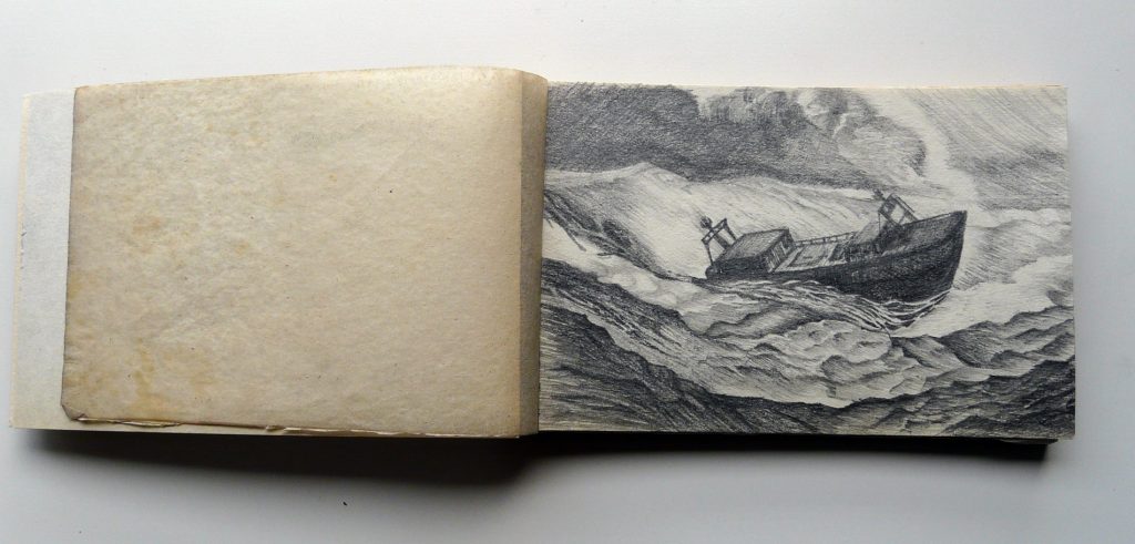 Por otro, las composiciones pictóricas del siglo XIX sobre el naufragio. Este, bajo la idea romántica de lo heroico, aún tenía significado para la sociedad, era un “acontecimiento” digno de ser representado. Las he recreado en dibujos que repiten también su formato, un collage digital de imágenes de naufragios actuales procedentes de los medios de comunicación, que una vez impreso, completo con dibujo a lápiz. La propia factura evoca la forma de construir el mar en los grabados de naufragios antiguos. Aquí entiendo el pasado de nuevo, la historia del arte, como una herramienta para pensar esta tragedia contemporánea. Las cerámicas a modo de ajuar funerario, y los vídeos con dibujos de figuras extraídas de ánforas griegas, señalan la necesidad de luto. La documentación y la creación de archivos son fundamentales en este proceso, reforzando la reivindicación de la memoria.